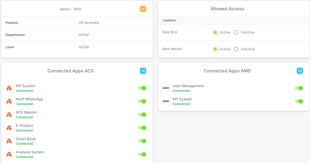 User management application to manage access for each user for each application, so that one account can log in to many applications